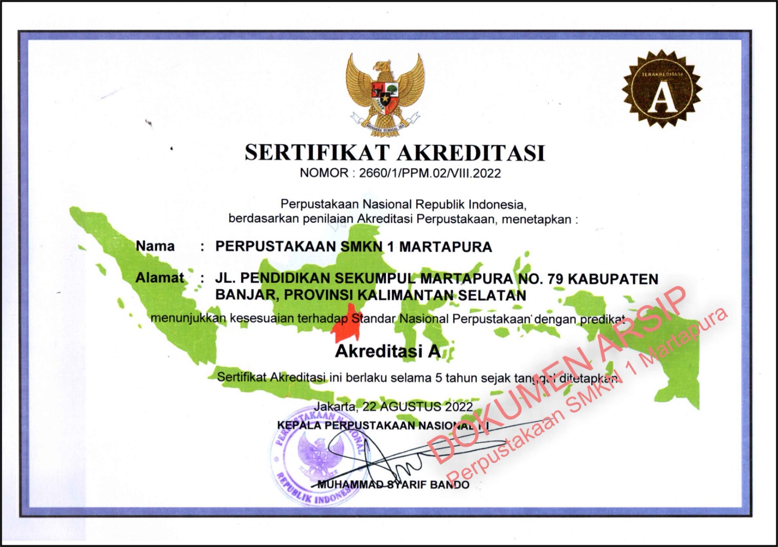 Perpustakaan SMK Negeri 1 Martapura telah terakreditasi "A" yang ditetapkan oleh Perpustakaan Nasional Republik Indonesia pada tanggal 22 Agustus 2022.